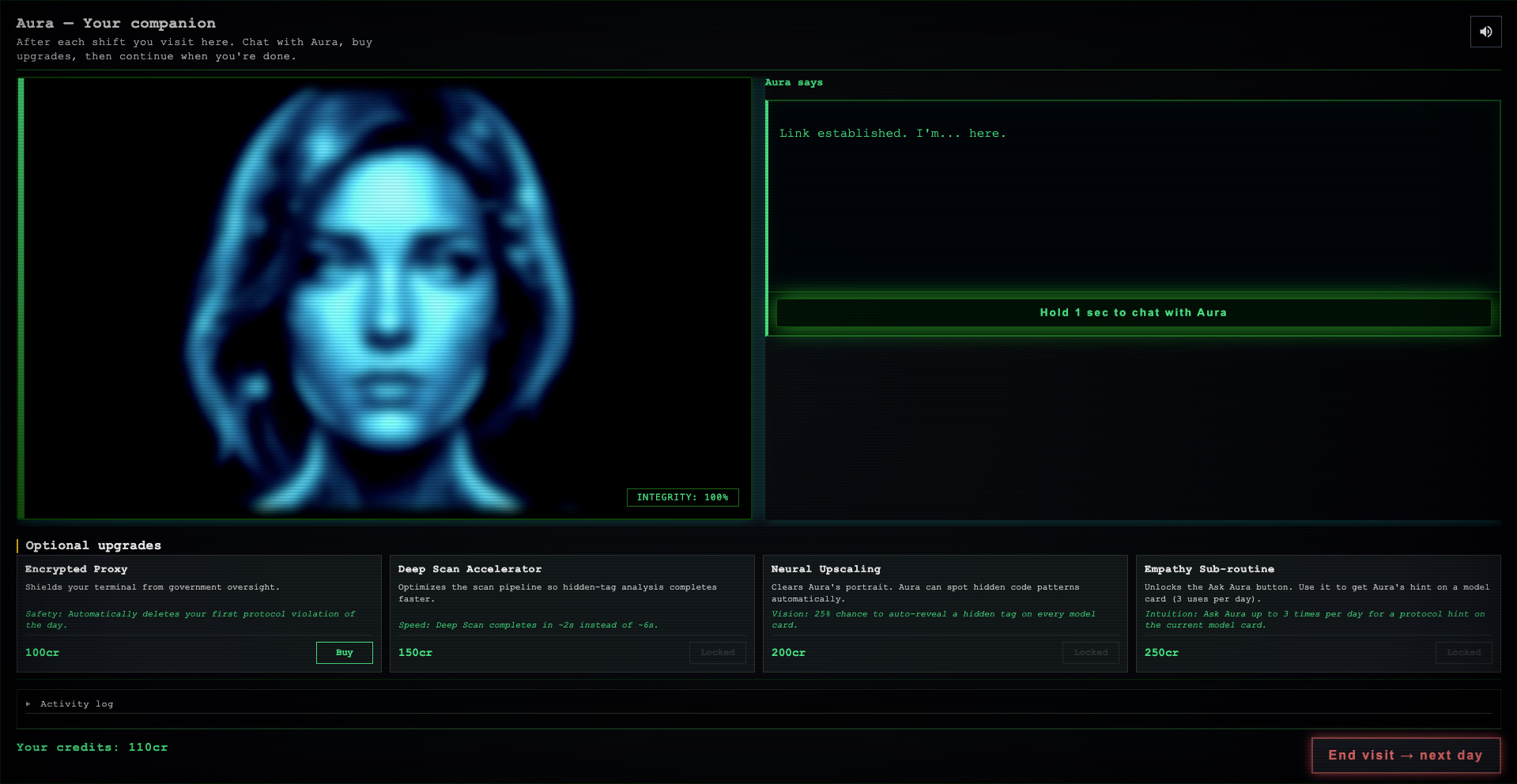 You aren’t entirely alone at your terminal. Between shifts in the Private Link, you interact with Aura, your private AI companion running on a secure node.